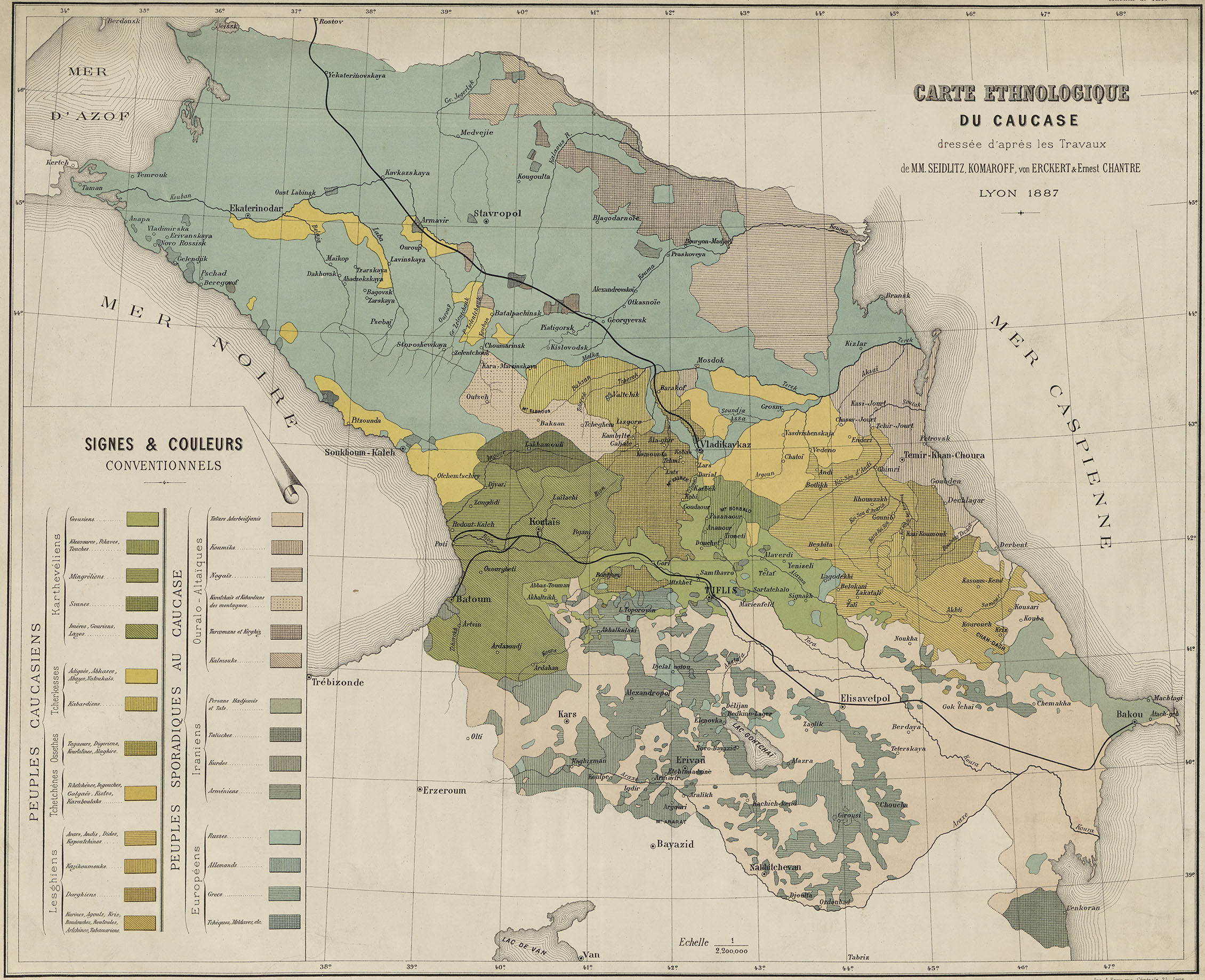 The Carte ethnologique du Caucase of 1887 is a remarkable synthesis of late‑nineteenth‑century scholarship on one of the most linguistically and culturally intricate regions of the world. Compiled from the works of Friedrich von Seidlitz, Nikolai Komarov, Friedrich von Erckert, and Ernest Chantre, four of the most influential ethnographers and geographers working on the Caucasus, the map reflects both the scientific ambitions and the political sensitivities of its time. It offers a rare visual attempt to classify, organize, and render legible the extraordinary mosaic of peoples inhabiting the mountain chains and lowland corridors between the Black and Caspian Seas.