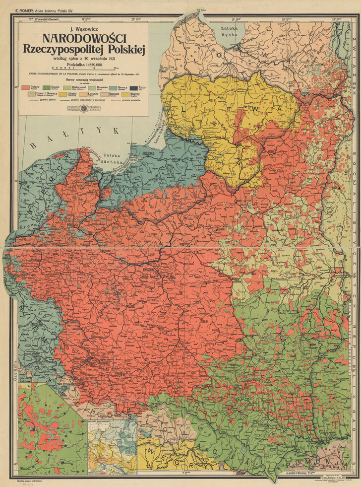 Source: J. Wasowicz, Narodowości Rzeczypospolitej Polskiej według spisu z 30 września 1921 (Ethnographic map of the Republic of Poland, based on the census of September 30, 1921), Instytut Kartograficzny im. Eugeniusza Romera, Lwow-Warszawa, 1921.